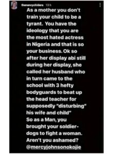 Nollywood actress, Mercy Johnson has been called out by a lady named Nancy Chidera over an incident at the actress daughter’s school.