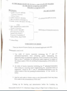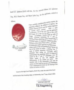 Benin High Court in Edo State, has restrained Labour Party and all its members from any suspension of its National officers till the determination of motion on notice on Wednesday.