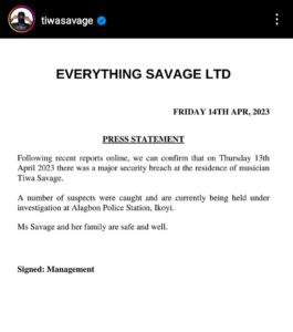 The statement read, “Following recent reports online, we can confirm that on Thursday 13th April 2023 there was a major security breach at the residence of musician Tiwa Savage.