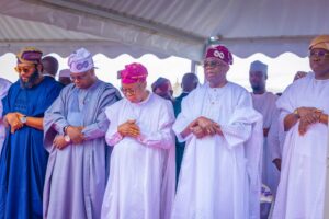 Gatekeepers News reports that Tinubu was joined at the prayer ground by former Governor Babatunde Raji Fashola, Minister of Marine and blue economy, Gboyega Oyetola amongst others.