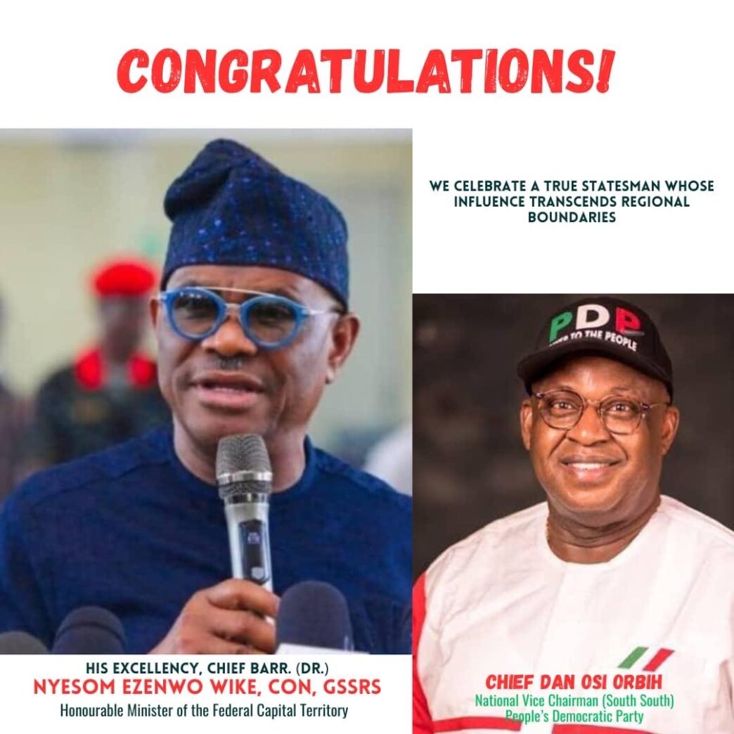 South-South leadership of the Peoples Democratic Party (PDP) has congratulated the Honourable Minister of the Federal Capital Territory, Nyesom Ezenwo Wike, on his conferment of an honorary Doctorate Degree by University of Port Harcourt.