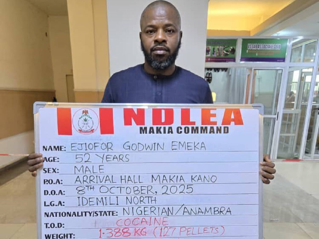 National Drug Law Enforcement Agency (NDLEA) has apprehended a 52-year-old businessman, Ejiofor Godwin, at the Mallam Aminu Kano International Airport for attempting to smuggle 127 wraps of cocaine concealed in his body and private parts.