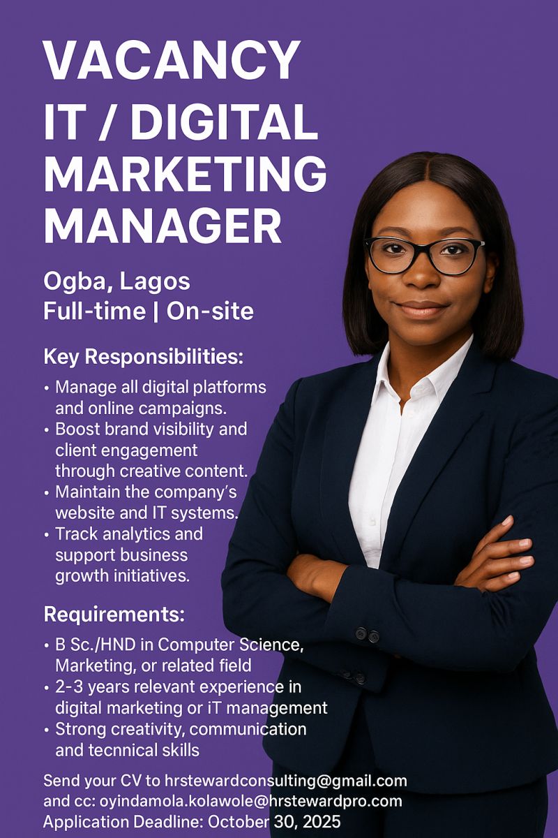 Send your CV to hrstewardconsulting@gmail.com and cc: oyindamola.kolawole@hrstewardpro.com using “IT/Digital Marketing Manager – KITAB” as the subject. 📞