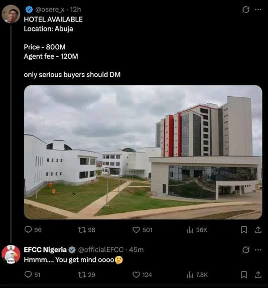 Gatekeepers News reports that in the post shared on X, a user identified as @osere_x uploaded a photo of the EFCC headquarters and advertised it as a “hotel” in the Federal Capital Territory, Abuja, offering it for ₦800 million, with an additional ₦120 million tagged as agent fees.