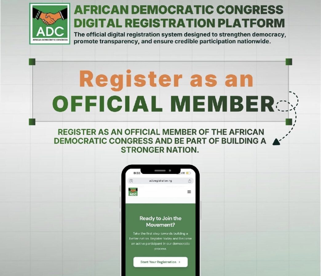 African Democratic Congress (ADC)has rolled out a free online membership registration platform across Nigeria as part of its early preparations for 2027 general election.