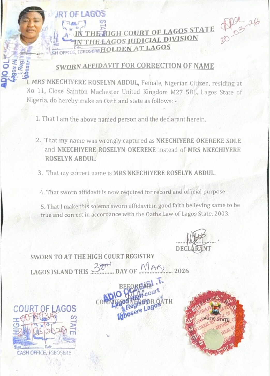 All former documents bearing the names Nkechinyere Okereke Sole and Nkechinyere Roselyn Okereke remain valid and should now be recognized as referring to Mrs Nkechinyere Roselyn Abdul.